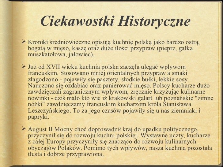 Ciekawostki Historyczne Kroniki średniowieczne opisują kuchnię polską jako bardzo ostrą bogatą w mięso kaszę oraz duże ilości przypraw pieprz gałka muszkatołowa jałowiec. Zobacz 1 odpowiedź na pytanie. PRZEPISY Maciej Nowicki szef kuchni Muzeum Pałacu Króla Jana III w Wilanowie odtworzył przepisy z siedemnastowiecznych książek.